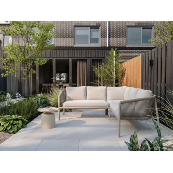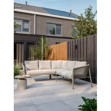De Lugo loungeset is een hoekbank voor buiten waarmee je in één keer een ruime zithoek maakt voor vijf personen. Met twee zijden van 222 cm creëer je een vaste plek om samen te zitten, te ontspannen en gasten te ontvangen. Het beige frame en de beige kussens zorgen voor een rustige, neutrale basis die past in veel tuinen en op veel terrassen.