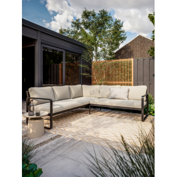 De Salta loungeset met beige kussens en zwart frame biedt direct een ruime en comfortabele hoekzit voor vijf personen in je tuin of op het terras.