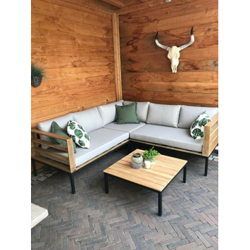 Om langer te kunnen genieten van de warme zomerdagen, is een loungeset ideaal. Je kunt deze in de tuin of op het balkon plaatsen. Loungeset Zion van het merk Wakefield bestaat uit een hoekbank, geschikt voor 5 personen, inclusief een moderne salontafel. Het zwarte onderstel van de bank is gemaakt van staal. De bovenkant is gemaakt van hout. De set bevat rug- en zitkussens waardoor je heerlijk lang kunt genieten. Deze kussens zijn grijs gekleurd. Ook heeft de set arm- en rugleuningen. De tafel kun je gebruiken om servies op te plaatsen. Het is verstandig om de kussens en banken op te slaan op een beschutte plek of af te dekken met een hoes, zodat je de set langer kunt gebruiken.