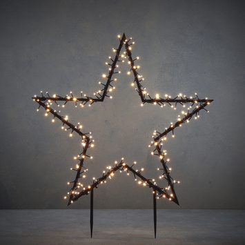 De stervormige tuinsteker met verlichting van Luca Lighting is een echte sfeermaker tijdens de mooiste, maar ook donkerste, dagen van het jaar. Het frame is gemaakt van stevig metaal en kan door middel van de twee pinnen gemakkelijk in de grond gezet worden. Rondom het frame zijn maar liefst 225 LED lampjes gewikkeld die een warm wit licht geven. Met de meegeleverde adapter kun je een timer aanzetten en jouw favoriete stand kiezen uit 8 verschillende opties. Het frame is zwart, waardoor het overdag niet opvalt en je in de avond alleen de stralende lampjes ziet. Echt een eyecatcher! De tuinsteker is verkrijgbaar in verschillende vormen en afmetingen. Dit model heeft de vorm van een ster en is L90 x H102 cm. Op dit product zit twee jaar garantie.