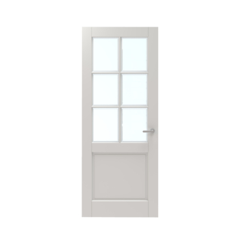 De Lundia binnendeur Frama En 2F01 blank facet glas wit gegrondverfd stomp 93 x 231,5 cm is een klassieke binnendeur met een open uitstraling. Deze paneeldeur hoort bij de Frama En-serie, een van de meest gekozen modellen in Nederland. Het ontwerp is tijdloos en geschikt voor zowel moderne als traditionele interieurs. Het bovenste gedeelte van de deur bestaat uit zes glasvlakken die worden gescheiden door smalle stijlen en dorpels. De vlakken zijn gemaakt van blank facetglas. Dat zorgt voor een verfijnde lichtinval en een rustige uitstraling. Deze deur is daardoor geschikt voor ruimtes waar je natuurlijk licht wilt binnenlaten, zoals een keuken of woonkamer.