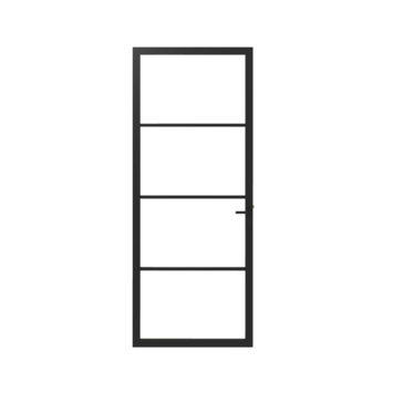 De Lundia binnendeur Lumen En 1C03 blank glas zwart gegrondverfd opdek rechts 93 x 231,5 cm inclusief slotgat, deurkruk zwart en loopslot is een moderne binnendeur die licht en ruimte combineert met een stoere uitstraling. De deur heeft een strak zwart frame met vier grote glasvlakken die zorgen voor veel lichtinval in huis. Door de horizontale verdelingen krijgt de deur een industriële uitstraling die goed past bij een Scandinavisch, modern of minimalistisch interieur.