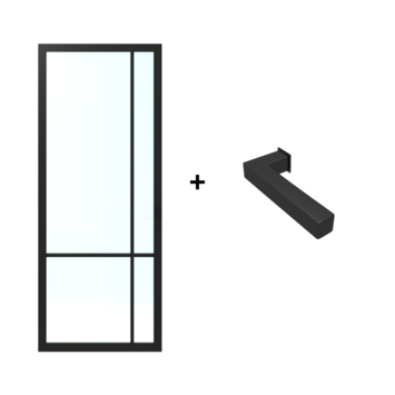 De Lundia binnendeur Lumen En 1C04 blank glas zwart gegrondverfd opdek rechts 88 x 231,5 cm inclusief slotgat, deurkruk zwart en loopslot is een moderne deur die licht en een speelse uitstraling brengt in huis. De deur heeft een zwart houten frame en een combinatie van verticale en horizontale glasverdelingen die samen zorgen voor een asymmetrisch en iets speelser lijnenspel dan je bij klassieke industriële deuren ziet. Het grote glasoppervlak laat veel licht door en maakt deze deur geschikt voor ruimtes waar je een open gevoel wilt behouden zoals een hal, keuken of woonkamer.