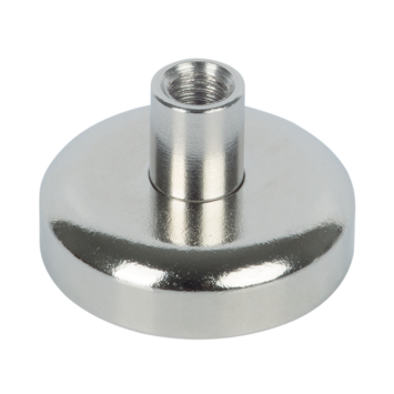 Neodym magneten in stalen behuizing met schroefdraadbus. De stalen mantel zorgt voor een hechtkrachtversterking van de magneet op het hechtvlak, terwijl de ingesloten zijkanten afgeschermd zijn. Met de schroefbus kunnen accessoires met passende schroefdraad aan de magneet worden bevestigd.