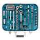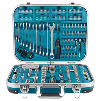 Makita 227-delige handgereedschapset in stevige koffer met aluminium frame. Bestaande uit: 139 bits in diverse maten, 2 schroevendraaiers, 3 bitadapters, 12 ring-/steeksleutels, 1 inbusset, 2 ratels (1/4" en 1/2"), 48 doppen in diverse maten, 2 verlengstukken, 2 bougiessleutels, 3 dopadapters, 2 cardankoppelingen en een aantal diversen.