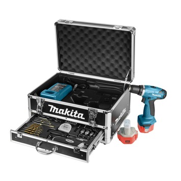 De Makita 12V Boor-/schroefmachine met 59-delige accessoiresset 6271DWPET9 is een ideale machine voor elke beginnende klusser. Het is een compacte en lichte machine met een 12Volt NiCd-accu van 1.3Ah. Deze accuboormachine van Makita heeft twee snelheden en een maximaal toerental van 1300 toeren per minuut. Als u de Makita 6271DWPET9 koopt, haalt u een compacte en complete machine in huis. Hij wordt geleverd in een handige opbergkoffer, met twee accu’s, een snellader van 30 minuten en een 59-delige accessoiresset bestaande uit boren, bitjes, rolbandmaat en een mes.