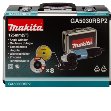 Met de GA5030RSP2 125 mm haakse slijper van Makita haalt u een veelzijdig stuk gereedschap in huis. Een haakse slijper gebruik je om metaal, steen of hout te bewerken wat makkelijk gaat met de 720 watt motor die een maximum van 11.000 toeren per minuut kan halen. De haakse slijper is geschikt voor het uitvoeren van regelmatige, lichte bewerkingen zoals het doorslijpen van waterleidingen, bouten en aluminium kozijnen, het inkorten van tegels of het afbramen van (las)naden. Deze compacte slijper heeft een extra slanke romp en ligt daardoor heel prettig in de hand. Deze haakse slijper weegt slechts 1,8 kg en dat zorgt ervoor dat je op een stabiele en comfortabele manier kunt slijpen. Dankzij een speciaal ontwerp van de binnenkant is machine optimaal beschermd tegen het binnendringen van stof en gruis. Hierdoor neemt de levensduur van de machine toe en heb je langer plezier van je gereedschap. De GA5030KSP2 wordt geleverd in een aluminium koffer met extra doorslijpschijven voor rvs en metaal en een afbraamschijf voor metaal. Deze haakse slijper is een mooie toevoeging aan het gereedschapsarsenaal van elke doe-het-zelver.