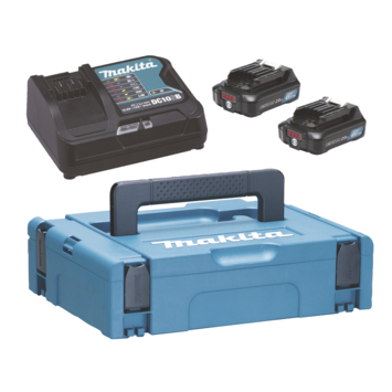 Startset met 2 maal accu BL1020B (10,8 volt, 2,0 Ah) en lader DC10SA. Geleverd in Mbox nr. 1. Opladen in 30 minuten.