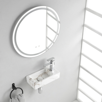 Met deze complete fonteinset geef je je toiletruimte een stijlvolle upgrade. De Ondine S mini fontein is compact en afgewerkt met een wit marmer effect. Hierdoor valt hij op, zonder dat het druk oogt. Het kraangat zit aan de rechterkant, net als het plateau. De messing kraan past perfect bij het fonteinbakje. De lange greep zorgt ervoor dat je ‘m makkelijk opent. De design sifon is extra laag en uitgevoerd in dezelfde geborsteld messing kleur. De vaste waste hoort daar ook bij, en blijft altijd open staan. Daardoor is deze set geschikt voor fonteinen zonder overloop. De onderdelen zijn stijlvol op elkaar afgestemd, en de marmerlook zorgt voor een luxe uitstraling. Inclusief plugboutenset, zodat je direct aan de slag kunt met de montage.