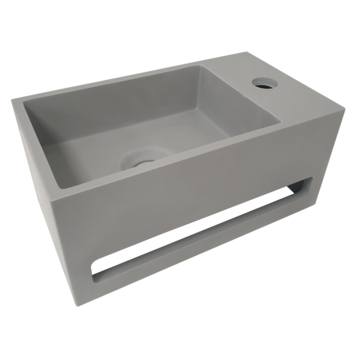 Zoek je een compacte fontein met een robuuste uitstraling en kraangat rechts? Deze variant in betonlook heeft een moderne, vierkante vorm en een geïntegreerde handdoekhouder. Handig als je geen plek hebt voor extra haakjes. De fontein is gemaakt van solid surface: een sterk composiet dat goed bestand is tegen vocht, vlekken en krassen. Schoonmaakmiddelen heb je nauwelijks nodig. Je stelt deze fontein helemaal zelf samen met een kraan, sifon en waste. Gebruik voor dit fonteintje een vaste waste in plaats van een clickwaste. Met z’n compacte afmetingen is deze fontein geschikt voor kleine toiletruimtes met een stoere look.
