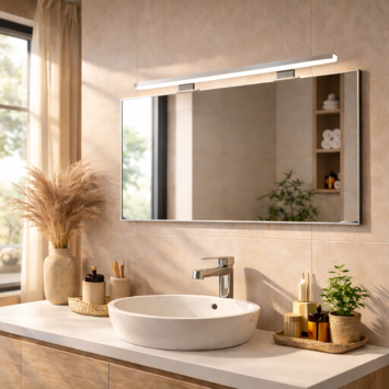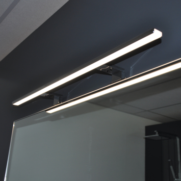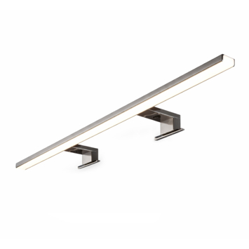 Met deze Syrin ledlamp van 800 mm haal je krachtig en helder licht in de badkamer. De geïntegreerde led van 13 watt geeft neutraal wit licht (4000 kelvin), prettig voor dagelijks gebruik. De brede stralingshoek (41–80°) zorgt ervoor dat je spiegel goed en gelijkmatig wordt verlicht. De lamp is geschikt voor montage op spiegels of kasten met een rand van minimaal 15 mm. Je klikt de steun eenvoudig vast, zonder schroeven of ingewikkelde aansluitingen. De transformator zit al in de lamp verwerkt, dus je kunt ’m direct aansluiten op het lichtnet (220V). De spatwaterdichte behuizing is bestand tegen vocht en past daardoor prima in de badkamer. De opalen kap verspreidt het licht egaal en voorkomt hinderlijke schittering. De behuizing is uitgevoerd in kunststof met een chroomlook.