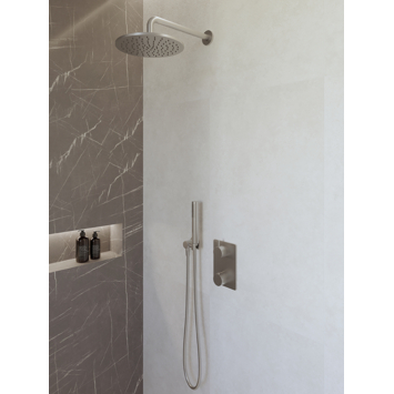 Geef je badkamer een moderne upgrade met deze inbouw regendoucheset in geborsteld staal. De kleur geeft de ruimte een frisse en stoere uitstraling. De hoofddouche heeft een brede straal die het water gelijkmatig over je lichaam verdeelt. De handdouche gebruik je los, bijvoorbeeld om het haar uit te spoelen of de douche schoon te maken. Met het afbouwdeel schakel je makkelijk tussen de twee douches. Alles sluit netjes op elkaar aan voor een strakke afwerking. De set bestaat uit: