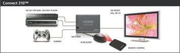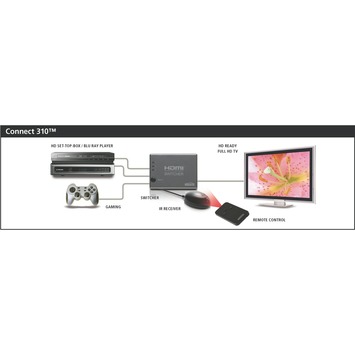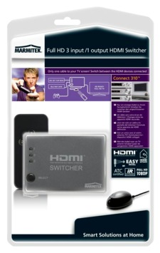De Connect 310 van het merk Marmitek maakt het mogelijk om 3 HDMI bronnen aan te sluiten op uw TV. U heeft slechts 1 HDMI verbinding nodig en hoeft nooit meer kabels te wisselen. De connector 310 is geschikt voor het aansluiten van spelcomputers zoals PlaStation en Xbox, Blu-ray speler, satellietontvanger en alle overige HDMI apparaten. De connector is geschikt voor Full HD 1080p en alle 3D formaten. De connector 310 schakelt automatisch en/of met afstandsbediening. De meegeleverde IR ontvanger maakt het mogelijk voor het bedienen van de connector 310 wanneer deze uit het zicht staat.