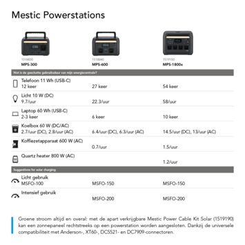 Met de Mestic Power Cable Kit Solar verbind je een zonnepaneel rechtstreeks met je powerstation. Zo gebruik je zelf opgewekte zonne-energie om apparaten te laten werken of je powerstation op te laden. Handig als je geen vaste stroomaansluiting in de buurt hebt, bijvoorbeeld op de camping of onderweg.
