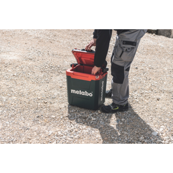 Met de Metabo KB 18 koelbox neem je gekoelde of warme dranken mee zonder afhankelijk te zijn van een stopcontact. Deze koelbox werkt op drie manieren: met een Metabo 18V accu, via het netsnoer of met de meegeleverde 12V-autokabel. Handig voor onderweg, op de bouw of tijdens het kamperen. Dankzij de krachtige brushless motor blijft de inhoud langdurig op temperatuur, ook als je de Eco-modus gebruikt om stroom te besparen. PET-flessen van 1,5 liter passen er moeiteloos in. Binnenin zit een rooster dat je eruit kunt halen voor extra ruimte of juist gebruiken om de boel netjes te houden. Deksel dicht? Dan vergrendel je ‘m stevig door de greepbeugel naar voren te klappen. Links aan de koelbox zit een geïntegreerde flesopener en in het aparte vak berg je de kabels netjes op. Deze koelbox werkt met 18V accu’s van Metabo of andere merken binnen het CAS-platform. Accu wordt niet meegeleverd.