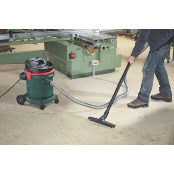 De Metabo alleszuiger AS 32 L is een mobiele en compacte nat-/droogzuiger. De alleszuiger is geschikt voor het opzuigen van stoffen van stofklasse L. Veelzijdig te gebruiken: afzuigen van stoffen en spaanders op elektrisch gereedschap, maar ook voor het reinigen van bijvoorbeeld bouwplaats, werkplaats en voertuig. Daarnaast is hij geschikt voor het opzuigen van vloeistoffen, waarbij het apparaat automatisch uitschakelt als de maximale vulhoogte (32 liter) is bereikt. Ook heeft de machine een inschakelautomaat, deze zorgt ervoor dat als het aangesloten elektrische gereedschap ingeschakeld wordt, de motor van de alleszuiger ook automatisch aangaat. Hij heeft een afwasbaar vouwfilter met een groot oppervlak, om te voorkomen dat deze snel verstopt raakt. Het filter is eenvoudig en snel te verwisselen. Verder heeft de machine een omwikkelingsmogelijkheid voor de kabel en een toebehorendepot en aflegvlak. De alleszuiger wordt standaard geleverd met zuigslang (Ø 35 mm, 3,2 m lang), 2 zuigbuizen, vouwfilter uit cellulose, spleetzuigmondstuk, buishouder, vloermondstuk (260 mm breed), zuigmondstuk (120 mm breed)