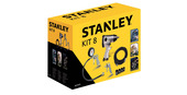 De Metabo LPZ 4 perslucht toebehorenset voor een compressor bestaat uit een blaaspistool, bandenpomp met spanningsmeter, verfspuitpistool met voorraadbeker en PA-spiraalslang.