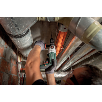 Universele klopboormachine met twee standen en variabel toerental voor het veelzijdig boren in vrijwel alle materialen Vario (V)-elektronica voor het werken met toerentallen aangepast aan het materiaal Stelwiel voor het instellen van het toerental Metabo S-automatic veiligheidskoppeling: mechanisch ontkoppelen van de aandrijving bij het blokkeren van het inzetgereedschap voor veilig werken Rechts- en linksdraaiend Booras met binnenzeskant voor schroefbits voor het werken zonder boorhouder