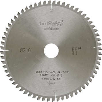 De Metabo cirkelzaagblad Ø 210x2.4x30mm is een zaagblad met 64 tanden. De tanden hebben een tandvorm FZ/TZ. Het blad is van HW/CT materiaal, is voor universeel gebruik bij veeleisende materialen. Bij zeer hoge vereisten m.b.t. de zaagkwaliteit, bv. laminaat, dunwandige profielen van kunststof, aluminium, koper en messing. Ideaal voor vele toepassingen in de binnen afwerking. Perfecte zaagresultaten ook bij dwarssneden in massief hout, ruwe, gecoate of gefineerde spaanplaten, MDF. Het zaagblad dient gebruikt te worden met een zeer hoog vermogen van de cirkelzaag op relatief langzame zaagsnelheid.