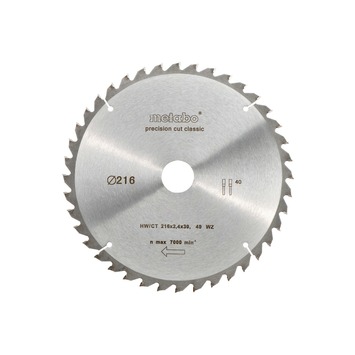 De Metabo cirkelzaagblad Ø 216x2.4x30mm is een zaagblad met 40 tanden. De tanden hebben een tandvorm WZ. Het blad is van het materiaal HW/CT. Het cirkelzaagblad heeft een zeer breed gebruiksspectrum in de houtbewerking. Voor zeer goede, zuivere zaagresultaten bij langs- en dwarssneden in zacht- en hardhout. Zeer geschikt voor massief en multiplexhout, ruwe spaanplaten, gecoat of gefineerd, MDF, compositiematerialen. Het zaagblad dient gebruikt te worden met een zeer hoog vermogen van de cirkelzaag.
