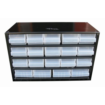 De Raaco Metalen Ladenkast met 19 laden (C4-19) is een stevige, metalen ladekast waarmee u in een handomdraai extra opbergruimte creëert. De kast wordt geleverd met 19 lades in 2 formaten, zodat u zowel grote als kleine spullen gemakkelijk en overzichtelijk op kunt bergen. De lades zijn geschikt voor vrijwel alle soorten spullen, zoals bijvoorbeeld gereedschap, schoonmaakmiddelen, tuinartikelen en accessoires. Dankzij het lage model kunt u ook spullen bovenop de kast plaatsen. Dit opbergsysteem is gemaakt van sterk materiaal (kunststof polypropyleen), wat een lange levensduur heeft. Kortom, met de Raaco ladenkast creëert u snel meer ruimte en vindt u voortaan uw spullen gemakkelijk terug!