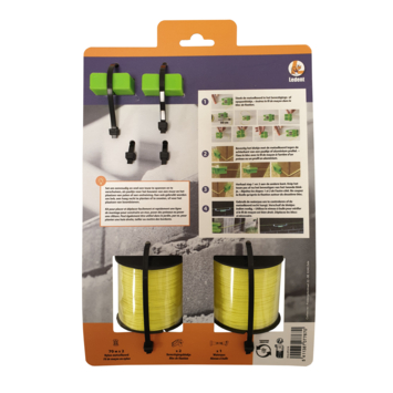 Set met duidelijk zichtbaar touw en de nodige bevestigingselementen, inclusief installatie stappenplan met foto's. Eenvoudig en snel een touw opspannen en verschuiven met de opspanblokjes. Bevestig de waterpas aan het touw en controleer of het touw perfect horizontaal hangt. Gebruik het touw als paslijn bij bvb. het bouwen van een muur en het plaatsen van palen of een omheining, een haag recht te planten of te snoeien, of bij het plaatsen van boordstenen.