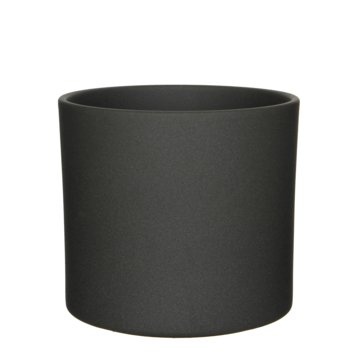 Donkergrijze bloempot van keramiek met een ruwe, matte afwerking. De pot is 26 cm hoog en heeft een diameter van 28 cm.