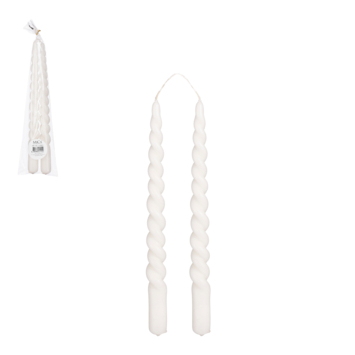 Set van twee gedraaide dinerkaarsen in een créme kleur. De kaarsen hebben een afmeting van H29 x D2,2 cm.