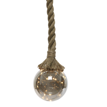 De Micro led bal touw 100 cm is zeer geschikt om kerstsfeer aan te brengen. Een scheepstouw met een doorzicht rookglazen kerstbal waarin led lampjes zorgen voor de verlichting. Werkt op batterijen en heeft een timerfunctie, 6 uur aan 18 uur uit.