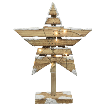Maak het gezellig in huis met deze prachtige houten ster. De ster is een klein beetje besneeuwd en wordt verlicht door 15 micro lampjes op metalen draad. Het draad is zo dun dat je het bijna niet ziet. Door het gebruik van batterijen ben je niet afhankelijk van de aanwezigheid van een stopcontact en kan de ster bijvoorbeeld op de kast of in de vensterbank zetten. Deze lichtset werkt met een 6-uurs timer. Nadat de timer is ingesteld, gaat de ster elke dag op hetzelfde tijdstip branden en blijven ze 6 uur aan.