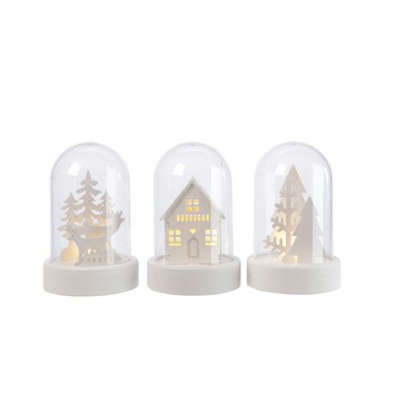 De serie Mini led stolp per stuk zijn drie apart verkrijgbare winterse voorstellingen met verlichting. Deze decoratieve kerstverlichting heeft een timer stand, zodat de verlichting vanzelf uit gaat. De drie voorstellingen zijn apart verkrijgbaar, het witte winterse huis, de kerstbomen of de rendieren voor het bos.
