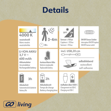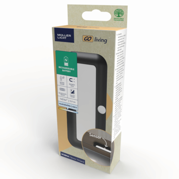 Mobina Push 15 is een zwarte onderbouwlamp van Müller-licht, ideaal voor bijvoorbeeld onder je keukenkastjes. De draadloze lamp heeft een ingebouwde ledlichtbron van 1.5 watt die zorgt voor een neutraal wit licht met een lichtopbrengst van 100 lumen. De installatie is eenvoudig door een zelfklevende strip.Je kunt de lamp aan- en uitzetten met de grote schakelaar. Aan de zijkant van de lamp is er nog een schakelaar waarmee je de automatische uitschakeltijd kunt instellen: 3 of 15 minuten. Mobina Push 15 is oplaadbaar via de meegeleverde USB-kabel. Volledig opgeladen kan de lamp tot 3 uur branden. De laadtijd bedraagt ook 3 uur. Met de ingebouwde bewegingssensor springt de lamp snel aan.