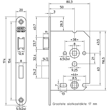 Nemef 1200 serie insteekslot badkamerslot/wc-slot met zwarte voorplaat Doorn 50mm PC 63mm