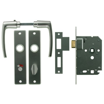Zoek je een slot voor op je badkamer- of toiletdeur? Dan zit je met het Nemef badkamerslot met krukgarnituur aluminium helemaal goed. Het maakt niet uit of je deur naar links, rechts, binnen of buiten opent, dit slot past overal en altijd. Het slot is afgewerkt in gelakt staal en is daardoor erg sterk. Door de universele maatvoering kan het bestaande slot makkelijk vervangen worden zonder dat er schade ontstaat. Dit artikel wordt geleverd met aluminium deurbeslag en een set bijpassende deurkrukken, zodat je complete beslag er als één geheel uitziet. Kortom: een handig badkamer- en toiletslot dat in iedere deur past.
