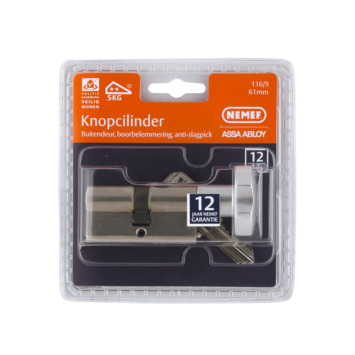 Wil je graag een veiligheidscilinder met aan één zijde een knopbediening? Ga dan voor de Nemef veiligheidsknopcilinder SKG** 116/9 (koper/nikkel) messing vernikkeld. Deze knopcilinder is voorzien van het keurmerk van SKG** (Stichting Kwaliteit Gevelbouw) en voldoen hiermee aan de eisen van het Politiekeurmerk Veilig Wonen. Bovendien heeft deze cilinder de zogenoemde 'aftastbeveiliging', wat inhoudt dat hij niet kan worden gemanipuleerd. Forceren van de cilinder wordt helemaal moeilijk doordat deze is voorzien van meerdere gehard stalen stiften. Ook is de cilinder beschermd tegen de bekende inbraakmethode 'slagsleutelmethode'. Houd er wel rekening mee dat je deze knopcilinder alleen gebruikt op buitendeuren zonder glaspartij. Kortom: het ideale slot met knop