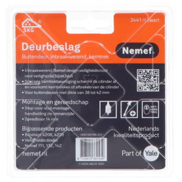 Heb jij een veiligheids(bijzet)slot op de voordeur en is jouw deur tussen de 38 en 42 mm dik? Dan is deze Nemef veiligheidsrozet de juiste keuze. De Nemef SKG***® veiligheidsrozet 3441-II beschikt over een speciale anti-kerntrekvoorziening die de cilinder in jouw deur afschermt én de actuele inbraakmethode 'kerntrekken' voorkomt. Het heeft een doorsnede van 60mm en is voorzien van een hoogwaardige en stijlvolle zwarte structuur afwerking