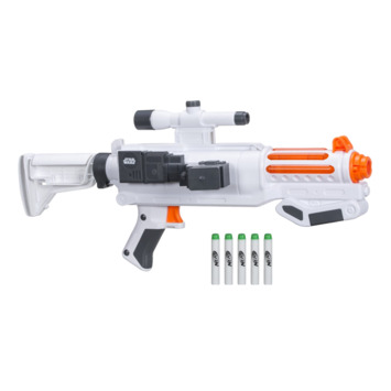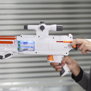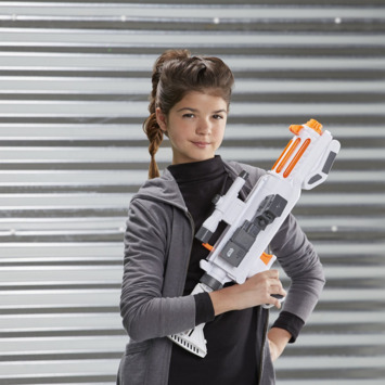 Met deze NERF Star Wars vergrendelbare Blaster, die schiet met glow-in-the-dark darts, kunnen kids spelen dat zij als Captain Phasma de strijd aangaan met het Verzet! De Captain Phasma Blaster biedt GlowStrike technologie die de darts oplaadt zodat ze gloeien wanneer ze afgevuurd worden. Laad 5 darts in de loop van deze enkelschots Blaster, trek de grendel naar achter om hem vuurklaar te maken en haal de trekker over om je gloeiende dart met laservuur geluidseffecten af te vuren! Blijf de grendel schuiven en de trekker overhalen om de overige darts af te vuren. Inhoud: NERF Star Wars Captain Phasma Blaster, 5 Elite GlowStrike darts. Wordt inclusief 3 AAA-batterijen geleverd in try-me touchbox. Geschikt voor kinderen vanaf 6 jaar.