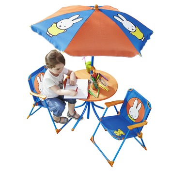 Nijntje tuinset bestaat uit een tafel, twee klapstoelen en een parasol. Kinderen kunnen hiermee heerlijk buiten zitten.