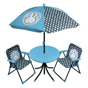 Nijntje tuinset bestaat uit een tafel, twee klapstoelen en een parasol. Kinderen kunnen hiermee heerlijk buiten zitten. Afm. tafel (Øxh) 50x46 cm. Afm. parasol (Øxh): 100x125 cm. Afm. stoel: (lxbxh): 29x25x52 cm.