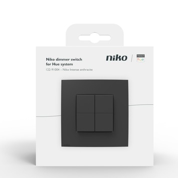 De Niko Dimschakelaar Philips Hue is verkrijgbaar in 2 kleuren: antraciet en wit. De schakelaar valt door zijn design en kleur niet op in je interieur. Dit is de antraciete versie.