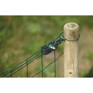 Draadspanset met 2 draadklemmen in de kleur groen, hiermee is de draad van bijv. een omheining of planten rek te spannen, geplastificeerd.