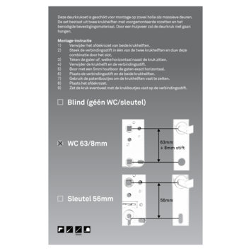 - Complete set: Inclusief deurkruk, schilden, vrij/bezet draaiknop en bevestigingsmateriaal