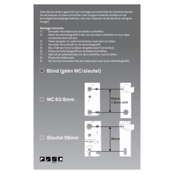 De deurkruk Parijs op langschild blind RVS zwart (zonder sleutelgat) is vervaardigd uit hoogwaardig geborsteld RVS, wat zorgt voor een moderne en strakke uitstraling. De deurklink is stevig gemonteerd op het schild en uitgerust met een veer, zodat de kruk in de juiste positie blijft zitten en niet naar beneden hangt. In de Parijs-serie zijn ook andere varianten beschikbaar, zoals een rond rozet, sleutelgat 56 mm en WC 63/8 mm. Er zijn geen afwijkende maten voor WC, sleutel en cilinder beschikbaar, wat deze deurkruk geschikt maakt voor standaarddeuren.
