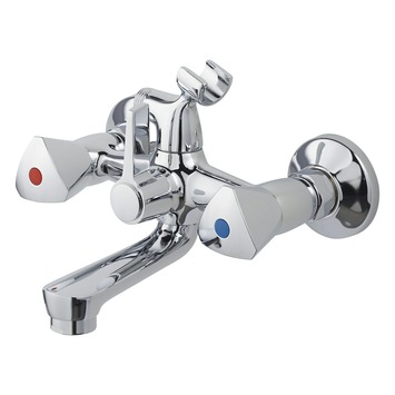 De OK badkraan 2-knops Chroom bestaat uit een chromen badkraan met omstelknop, 2 S-koppelingen, 2 rozetten en een montagehandleiding. De OK badkraan is een functionele kraan in een glanzend chromen afwerking. Aan de kraan is een handdouchehouder en doucheslangaansluiting gemaakt. Met de omstelknop kies je makkelijk tussen gebruik van de badkraan of de douchekraan. Gebruik alleen water en een zachte doek om de kraan schoon te maken. Gebruik geen schurend, bijtend, azijnhoudend of agressief schoonmaakmiddel. Besluit je deze kraan te kopen? Dan heb je 2 jaar garantie.