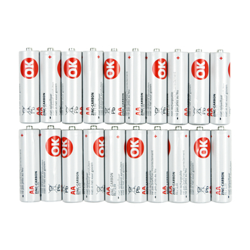 OK Batterij Zinc AA 20 stuks ook bekend als LR6, MN1500, AM3, UM3, HP7, D14, mignon of penlite. Zijn geschikt voor verschillende toepassingen zoals fotocamera's, zaklampen, afstandsbedieningen en speelgoed. In één verpakking zitten 20 AA batterijen.