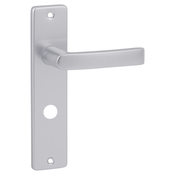 Deurkruk. Type Blok aluminium naturel , op kortschild voor wc, toilet of badkamer 63mm met stift 8mm. Deze deurklink is vast gemonteerd op het schild. Dus nooit meer de kruk los in je handen. In de serie Blok zijn ook sets t.b.v. loop en sleutel sloten beschikbaar.