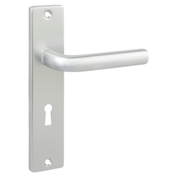 Deurkruk. Type Recht aluminium naturel, op kortschild met sleutelgat 56mm. Deze deurklink is vast gemonteerd op het schild. Dus nooit meer de kruk los in je handen. In de serie Ovaal zijn ook sets t.b.v. loop en WC sloten beschikbaar.