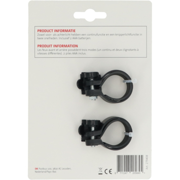 Met de OK fietsverlichtingset LED Classic zorg je dat je altijd goed zichtbaar bent op de fiets. De set bestaat uit een voor- en achterlicht, elk met drie LED-lampjes en vier standen: aan, twee knipperstanden en uit. Je bedient de lampen gemakkelijk via de drukschakelaar. Het voorlicht bevestig je met de stuuradapter, en het achterlicht plaats je op de zadelpen of achtervork. De lampen zijn uitneembaar, zodat je ze meeneemt of op je kleding of tas bevestigt. Inclusief vier AAA-batterijen voor direct gebruik.