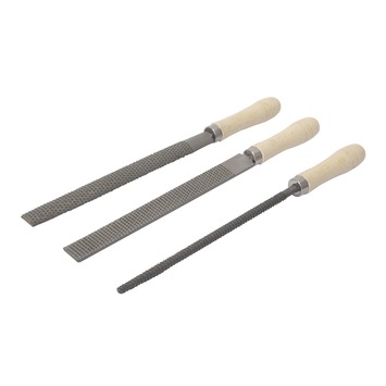 De OK-raspenset bevat 3 stuks raspen voor houtbewerking, namelijk een rechte rasp, een halfronde rasp en een ronde rasp, oftewel een rattenstaart. Alle 3 raspen zijn voorzien van een houten handvat waarmee de raspen makkelijk te hanteren zijn. De totale lengte van alle raspen is 20cm. Met deze OK-raspenset heeft u een complete set aan raspen voor het vijlen van zowel ronde als vlakke vormen. Het is aan te raden om het vijlwerk af te werken met een fijne GAMMA-vijl. Deze vindt u in GAMMA?s assortiment, evenals andere losse raspen en vijlen.