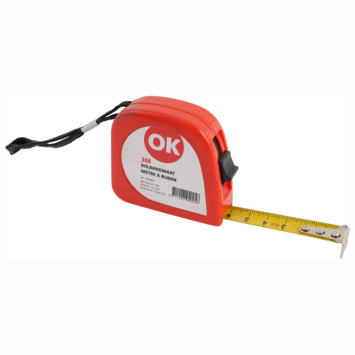 Met de OK rolbandmaat van 3meter meet u zowel buitenwerkse als binnenwerkse maten. De geijkte rolmaat is voorzien van een blokkeerknop. Hiermee zet u de maatband eenvoudig vast op de gewenste meetafstand tot maximaal 3meter. Wanneer u klaar bent met opmeten zorgt de krachtige veer van de rolbandmaat ervoor dat de band weer netjes wordt opgerold. Dit oprollen gebeurt in de kunststof kast die schokbestendig is. Tevens is de rolmeter, of rolcentimeter, voorzien van een broekclip en draagbandje. Met behulp van de handige clip en/of het draagbandje bevestigt u het meetgereedschap eenvoudig aan uw broek, jas of broekriem. Zo heeft u de rolbandmaat van OK met een totale lengte van 3meter altijd direct bij de hand. Op zoek naar een andere rolbandmaat? Bekijk GAMMA?s assortiment met daarin diverse rolbandmaten met verschillende lengtes.